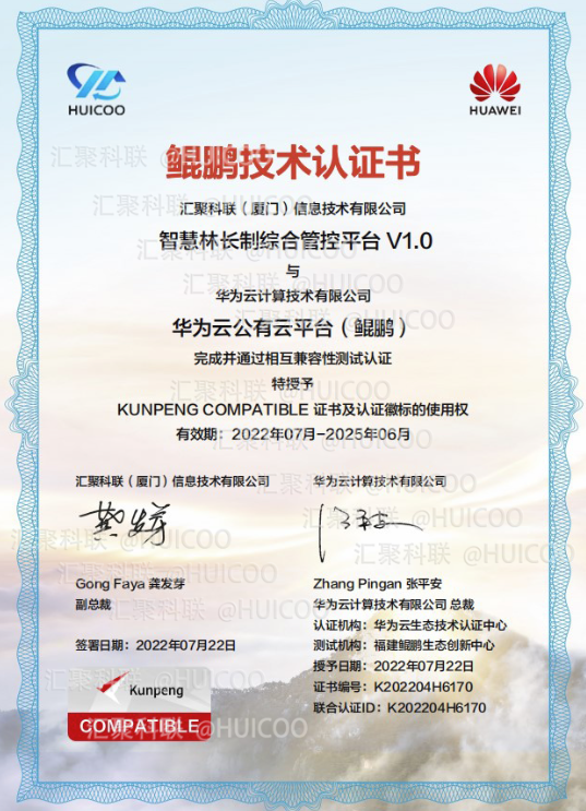 匯聚科聯(lián)自主研發(fā)的“智慧林長(zhǎng)制綜合管控平臺(tái)1.0”與華為云計(jì)算技術(shù)有限公司的華為云公有云平臺(tái)(鯤鵬)完成并通過相互兼容性測(cè)試認(rèn)證,正式獲得華為鯤鵬技術(shù)認(rèn)證書